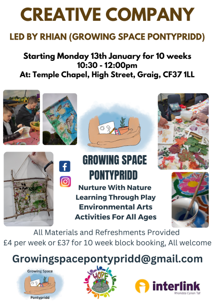 Join us for some weekly creative company led by creative arts tutor Rhian from Growing Space Pontypridd CIC. All materials and equipment provided and a hot cuppa! Come along and join our friendly group kindly supported by Hope Christian Community at Temple Chapel, High Street, Graig, CF37 1LL and part funded by Interlink Small Grants scheme.