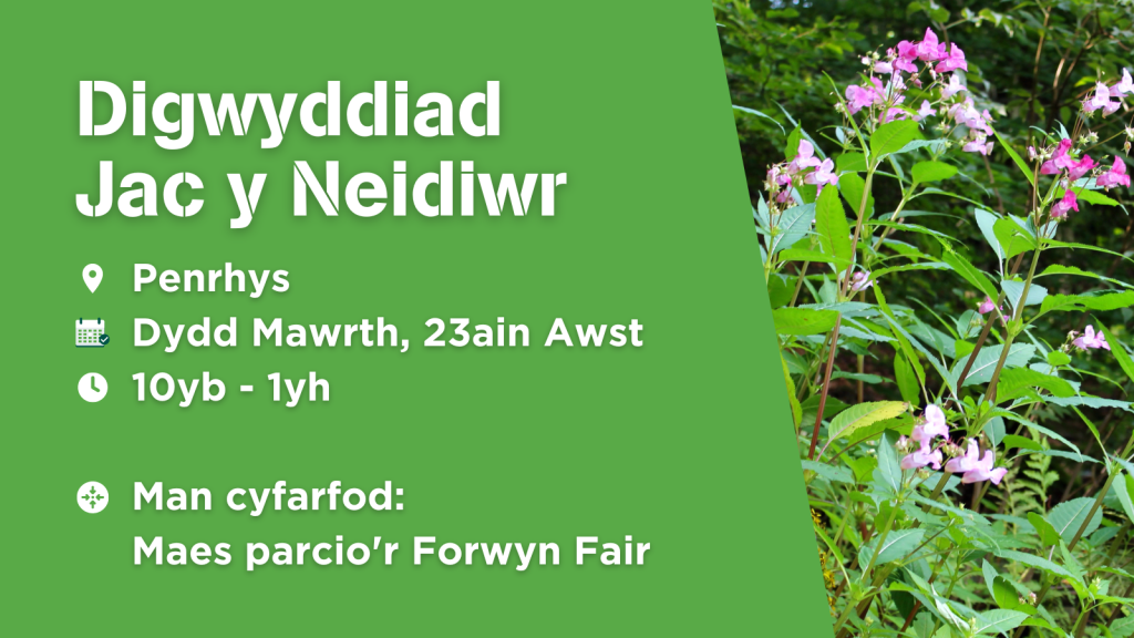 Mae Jac y Neidiwr yn rhywogaeth ymledol sydd, wedi'i adael, yn gordyfu ac yn cyfyngu ar ddatblygiad rhywogaethau brodorol ar lethrau ein bryniau Cymreig. Ymunwch â Tara o'r Ymddiriedolaeth Natur i ddysgu pam a sut y dylech chi ddelio gyda Jac y Neidiwr i adfywio'r llethrau lle rydych chi'n byw. Bydd y gweithgaredd yn cynnwys cerdded y llethrau i adnabod Jac y Neidiwr a thynnu neu dorri'r planhigion cyn iddynt flodeuo a thaenu eu hadau.
