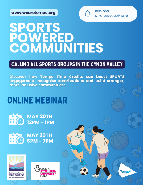Are you a sports club in Cynon Valley? Would you like to know more about using Tempo Time Credits to help recruit, retain and recognise volunteers? Or do you offer Time Credits and need support to encourage your volunteers to earn and spend?