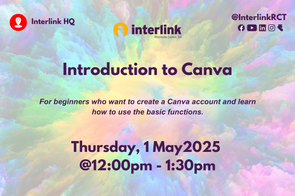 Join us in person at Interlink HQ for an Introduction to Canva with Amber Lewis-James, Interlink's Marketing and Communications Officer, and learn how to create a Canva account and use the basic functions.