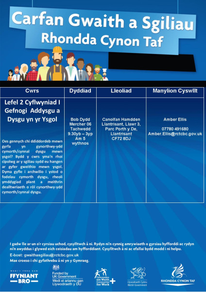 Oes gennych chi ddiddordeb mewn gyrfa yn gynorthwy-ydd cymorth/cynnal dysgu mewn ysgol? Bydd y cwrs yma'n rhoi cipolwg ar y sgiliau sydd eu hangen ar gyfer gweithio mewn ysgol. Dyma gyfle i archwilio i ystod o fodelau cymorth dysgu, rheoli ymddygiad plant a meithrin dealltwriaeth o rôl cynorthwy-ydd cymorth/cynnal dysgu.