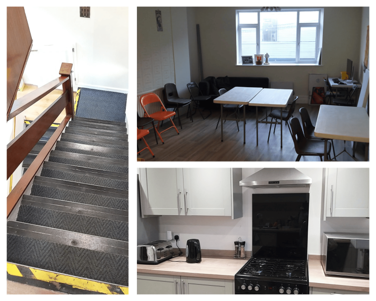 Accessibility: The meeting room is reached by going up a narrow staircase of 21 steps with a 180 degree turn halfway up. There are a further 3 steps up to the kitchen and toilet. Click here for a short video tour.