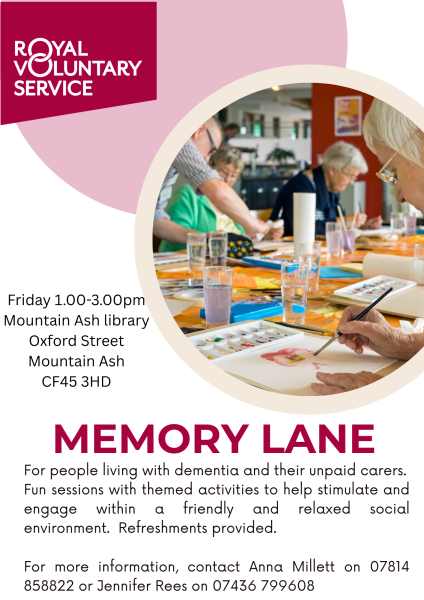 Mountain Ash Memory Lane group runs on Fridays 1.00 - 3.00pm in Mountain Ash Library. We provide stimulating activities for people living with dementia with the option for their carers to meet in a separate room. The group runs with a staff member of RVS + support from volunteers.