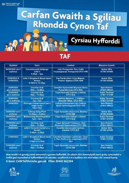 Yn rhan o gynllun Gwaith a Sgiliau Cyngor Bwrdeistref Sirol Rhondda Cynon Taf mae cyfle cyffrous wedi codi i unigolion gymryd rhan mewn cyrsiau hyfforddi sydd wedi'i ariannu'n llawn.