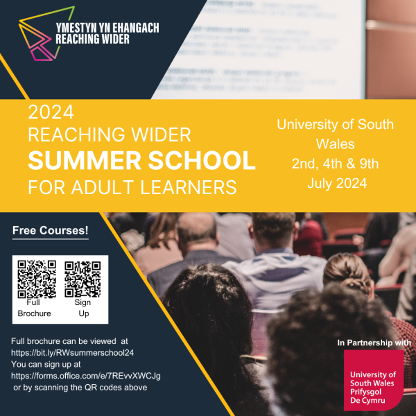 Reaching Wider Adult Summer School is taking place on 2nd 4th and 9th July. There is a range of FREE one and half day taster sessions for over 18s available. It’s a great opportunity for adults to spend time trying out new learning experiences on University of South Wales Treforest Campus (except Criminology which is on Glyntaff Campus). There are no limits to the number of days participants can book onto, so I would encourage anyone to come along and give a few of our brilliant training days a go. Priority is given to adults living in areas of greatest deprivation and those who do not already have a degree qualification. Booking is essential and spaces are limited. Here are the full brochures - English https://bit.ly/RWsummerschool24 Cymraeg https://bit.ly/RWysgolhaf24