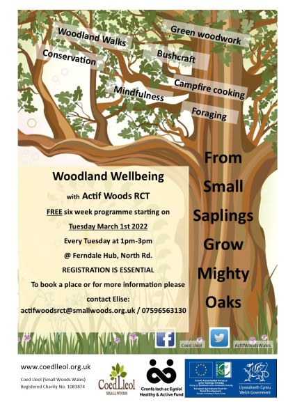 Actif Woods RCT are delivering a six-week wellbeing woodland programme in Ferndale Hub (please see poster attached) starting on the Tuesday 1st March on 1pm-3pm and will continue every Tuesday. We will have a range of wellbeing activities including Woodland Craft, Artist Charcoal, Foraging, Mindfulessness and much more!
