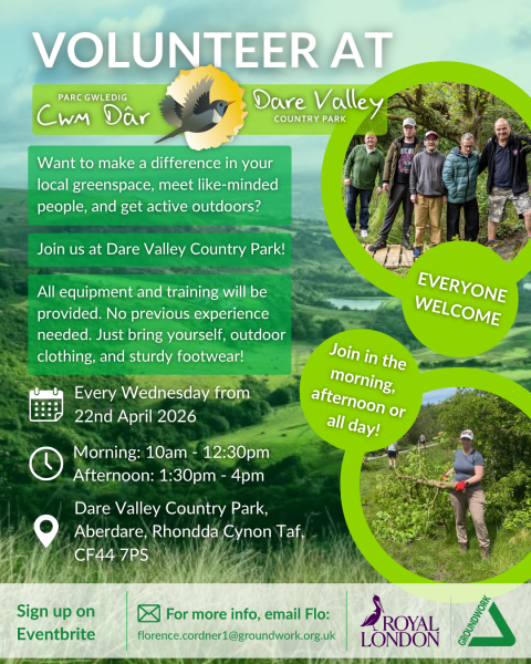 Come along to weekly volunteer sessions on Wednesday mornings or afternoons (or both!), at Parc Gwledig Cwm Dâr / Dare Valley Country Park