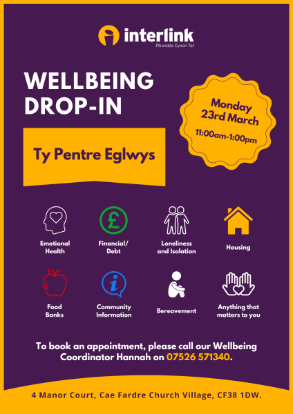I will be running a Wellbeing 'Drop In' in at Ty Pentre Eglwys Hub, Cae Fardre, Church Village. This is for anyone in the community to pop in to have a chat to discuss anything related to their Wellbeing. 23rd February 2026 11am - 1pm. Feel Free to Pop in for a chat and cuppa.
