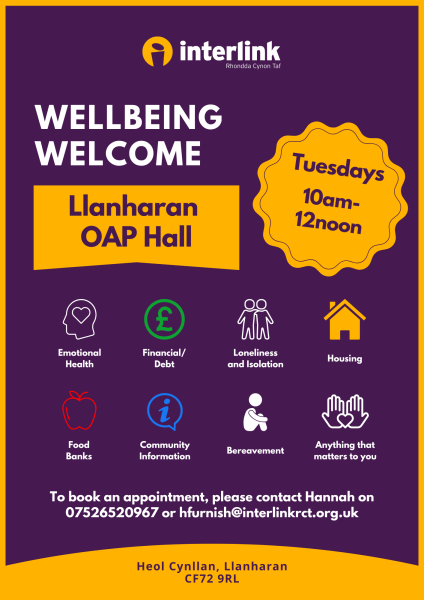 Our Wellbeing Coordinator Hannah is running a Wellbeing Welcome Drop In at Llanharan OAP Hall every Tuesday 10.00am - 12.00pm alongside the Warm Hub at this venue.